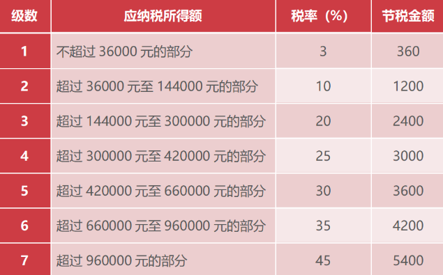 以上举例的个人收入金额适用的是20%税率,由于我国个人所得税制采取的是七级超额累计税率,针对不同收入人群,具体节税金额如下: